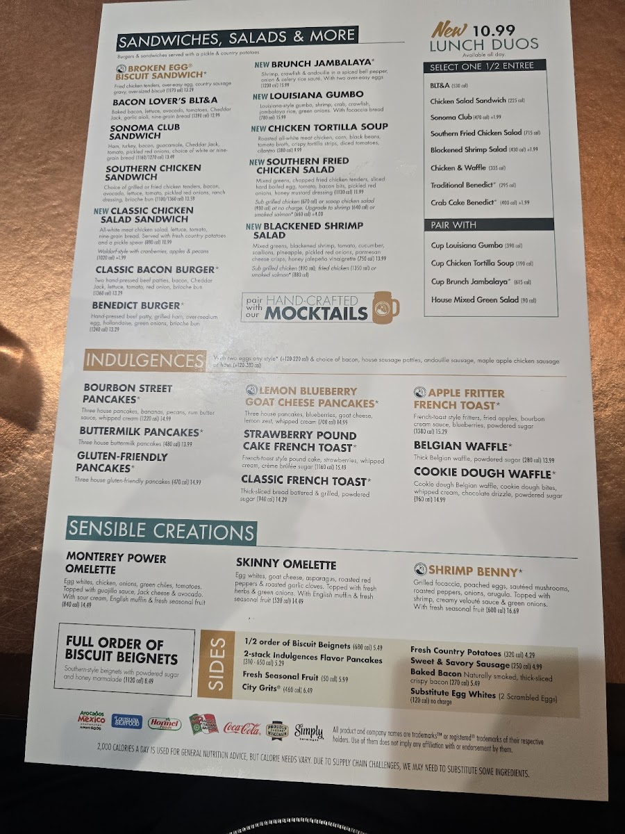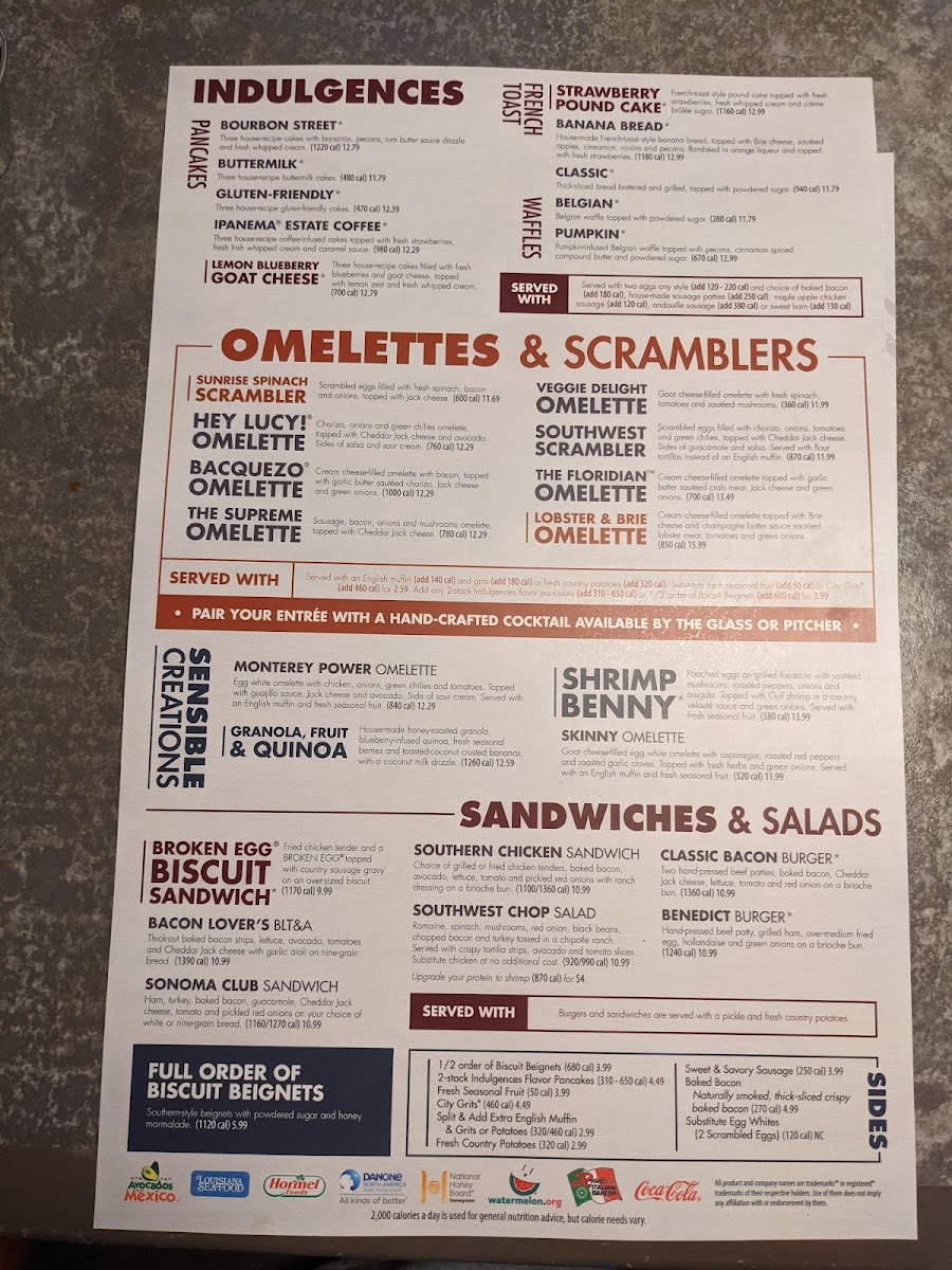 Scrambled eggs filled with country ham, onions and tomatoes over Cheddar Jack cheese grits. Topped with country sausage gravy. Served with baked bacon and an over-sized biscuit. (1370 cal) Pair with an Abita Amber Lager (130 cal) and Rwanda Single-Origin Coffee (0 cal).