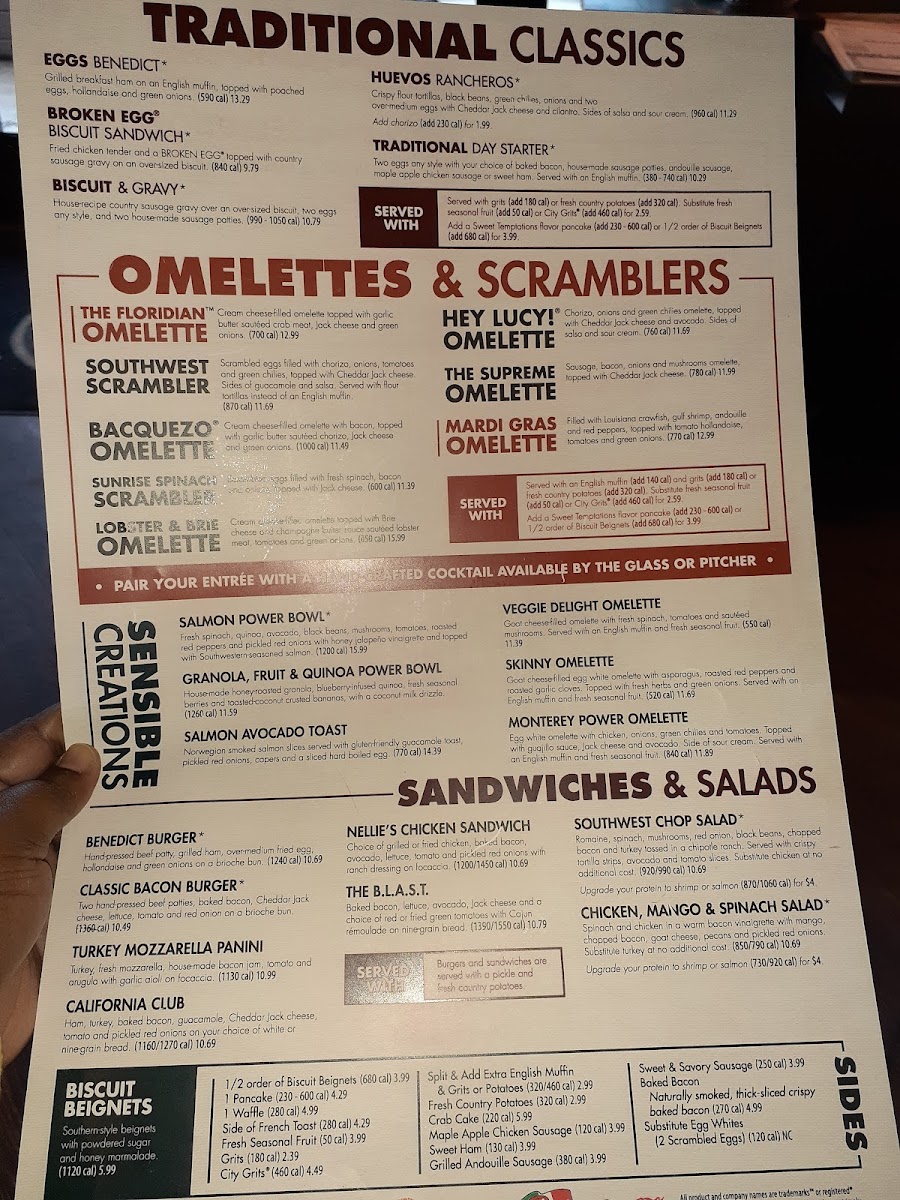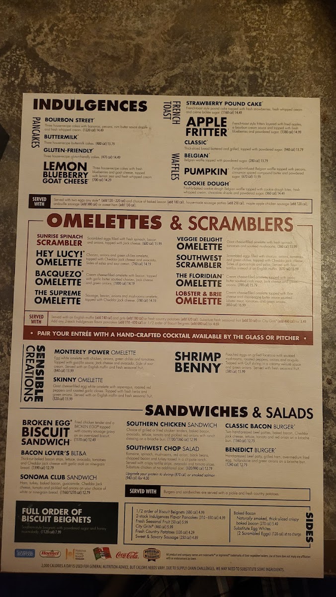 Scrambled eggs filled with onions, red peppers and andouille, topped with fried soft shell crab, lemon aioli and green onions. Served with an English muffin (800 cal) and grits or fresh country potatoes (180/320 cal)